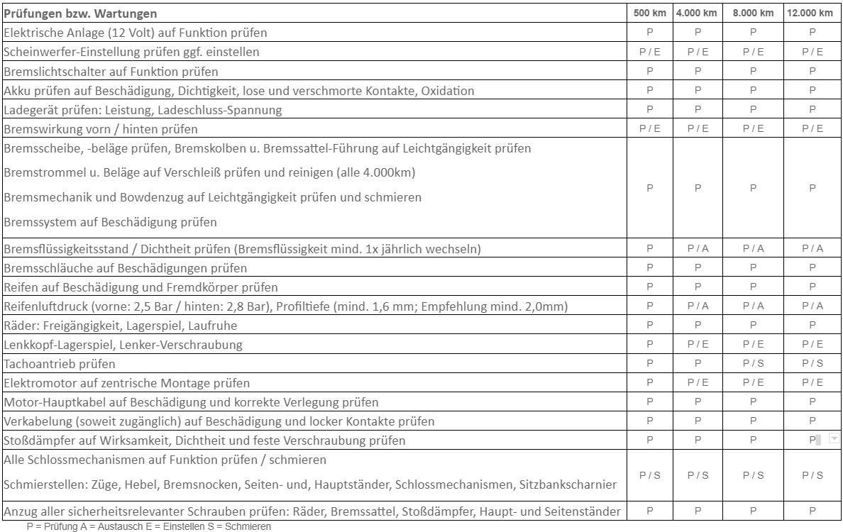 Ähnlich, wie man es bereits von Verbrennungsmotoren kennt, müssen auch E- Roller sowie E-Motorräder regelmäßig gewartet werden. Der Verschleiß ist zwar geringer als bei Verbrennungsmotoren, jedoch fällt auch hier ein Service- Check an. Um die Fahrtüchtigkeit zu gewährleisten, sollte man sein Fahrzeug zu den unten genannten Kilometern oder mindestens alle 2 Jahre warten.